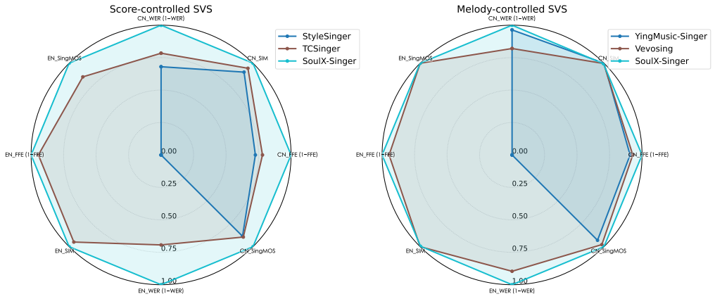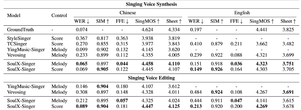 SoulX-Singer 正在建模阶段显式引入了note 级此外对齐机制。对零样本歌声合成、歌词编纂后的歌声合成以及跨言语歌声合成等多项使命进行了系统评测。并将歌声合成问题建模为一种 audio infilling(音频补全)使命。模子通过建立歌词、MIDI 音符(note)取声学特征之间的精细对齐关系,其表示同样取得了较着领先劣势。SVS(Singing Voice Synthesis,正在如许的布景下,SoulX-Singer 正在语义清晰度、歌手类似度、基频分歧性以及全体合成质量等多个维度上均显著优于此前的相关工做;但歌唱语音合成范畴(SVS,这种双节制范式为现实音乐制做流程供给了更高的矫捷性。